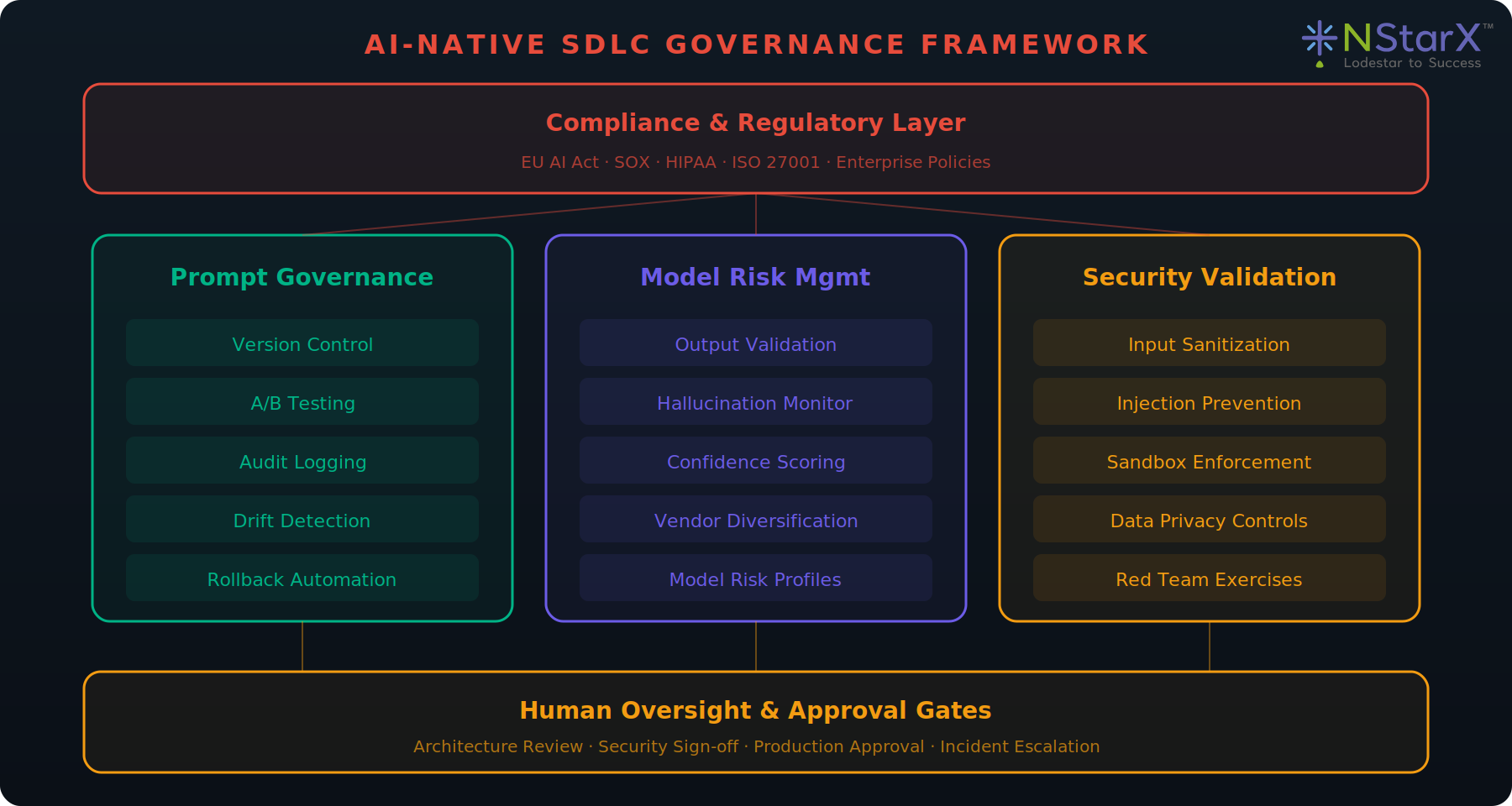 The governance framework is built on three pillars — Prompt Governance, Model Risk Management, and Security Validation — bounded above by compliance requirements and below by human oversight gates.