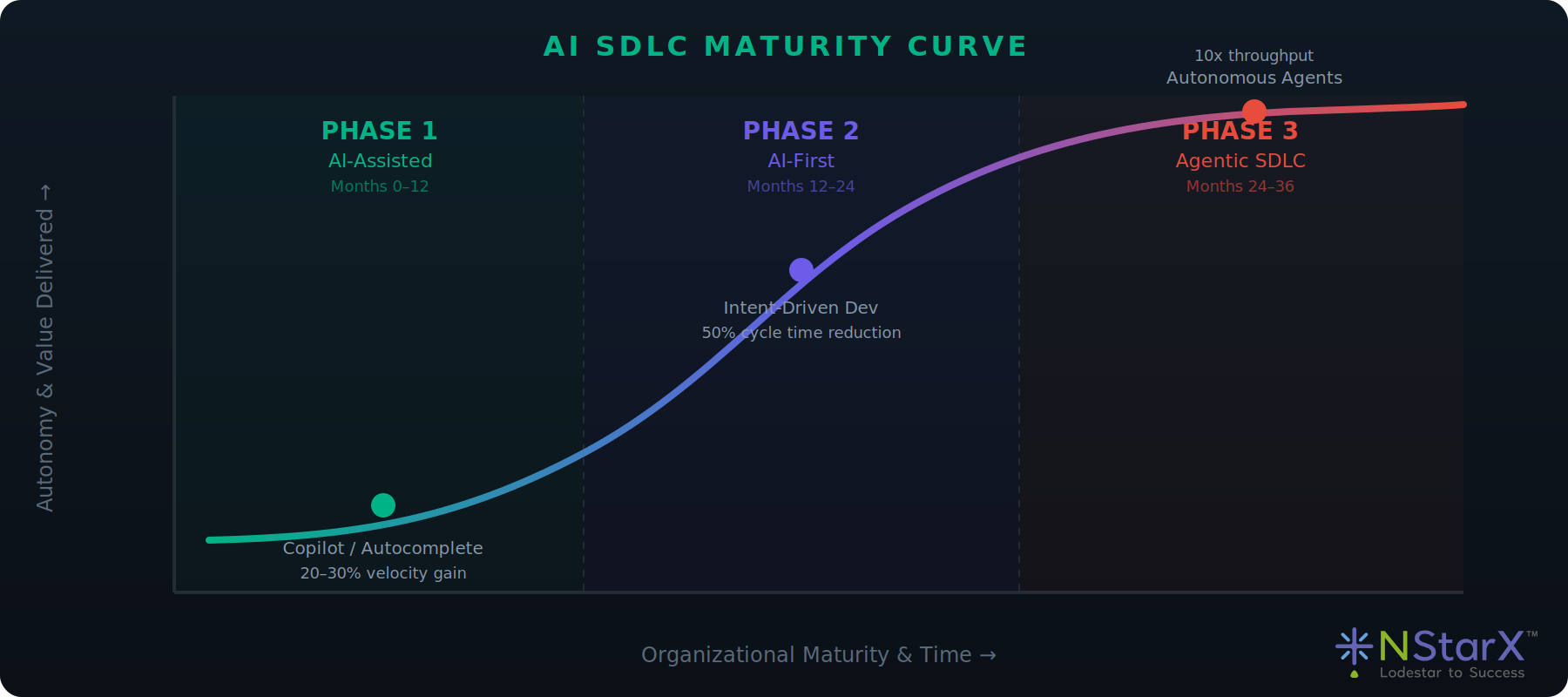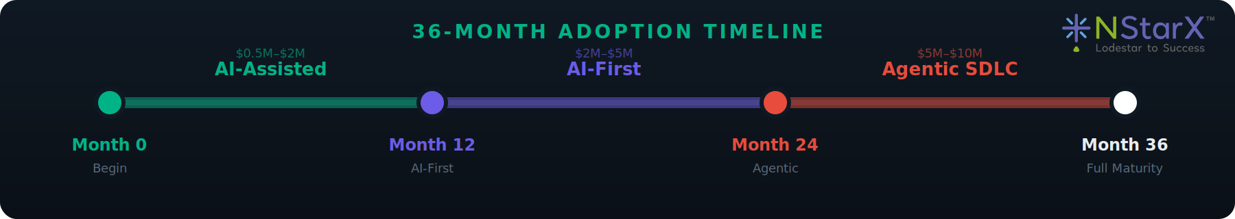 Phase 3 — Agentic SDLC (Months 24–36): Deploy autonomous agents. Investment: $5M–$10M. Success metric: 10x improvement in feature throughput.