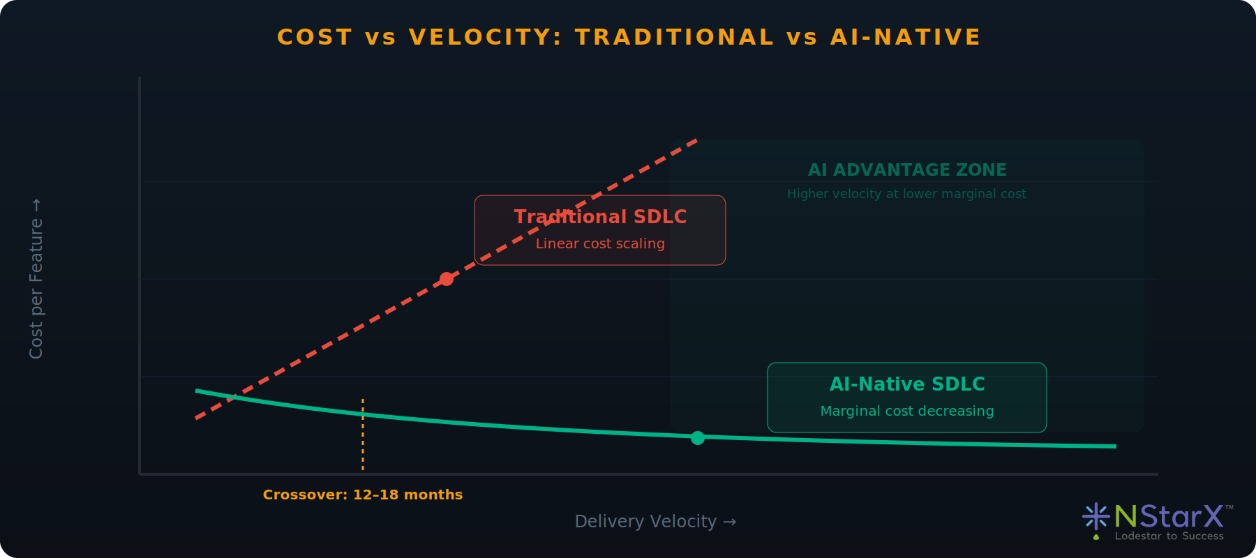Traditional SDLC exhibits near-linear cost scaling. AI-native SDLC shows logarithmic cost behavior: after initial platform investment, each incremental unit of velocity costs less. The crossover typically occurs 12–18 months after Phase 1 begins.