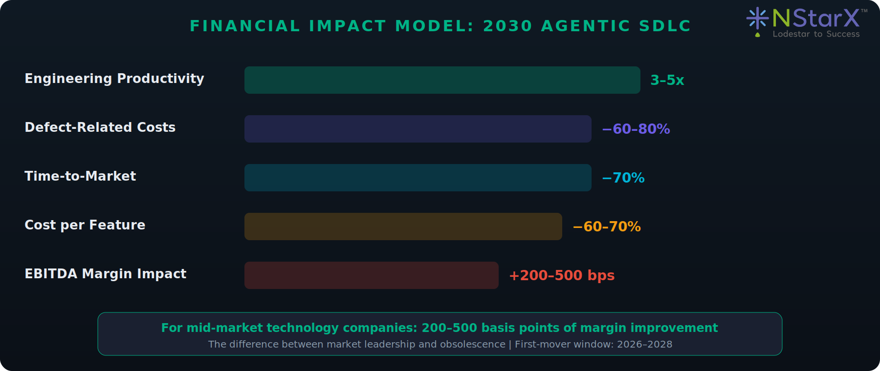 The EBITDA impact is significant: 3–5x engineering productivity improvements, 60–80% reductions in defect-related costs, and 200–500 basis points of margin improvement for mid-market technology companies.