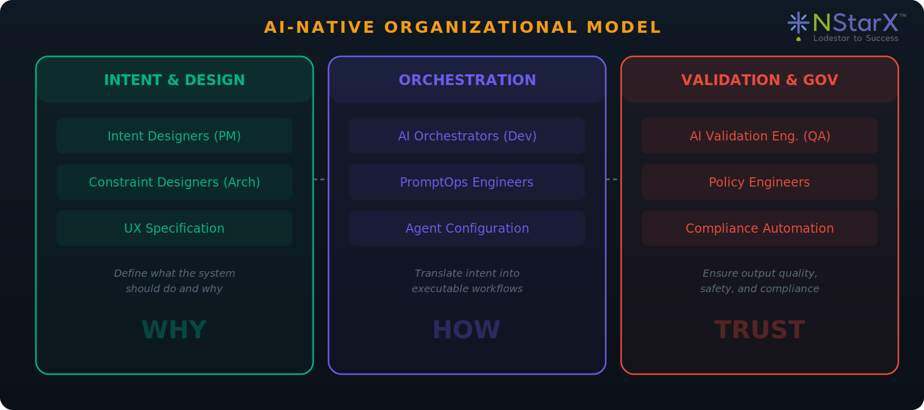 The AI-native organization restructures around three pillars: Intent & Design (WHY), Orchestration (HOW), and Validation & Governance (TRUST).