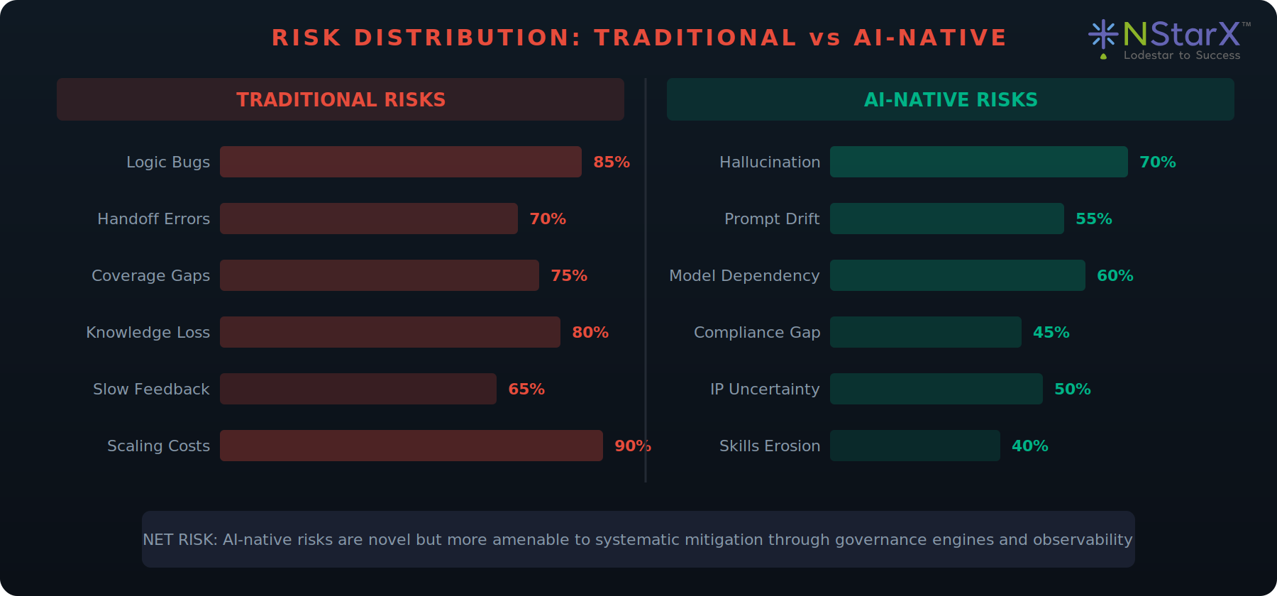 Traditional risks are dominated by human throughput constraints. AI-native risks are novel (hallucination, prompt drift) but more amenable to systematic mitigation through governance engines and observability.
