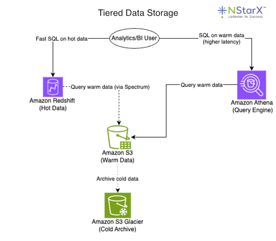 In AWS, a common strategy is to design a tiered storage solution. Tiered storage is the strategy of keeping “hot” frequently accessed structured data in Redshift, while offloading less-frequently used “warm” data to a data lake on Amazon S3, that can be queried via Redshift Spectrum or Athena, and finally “cold” data in AWS Glacier for data that is infrequently accessed but cannot be deleted. For example, an e-commerce company might keep its transactional and customer data in a warehouse, like Amazon Redshift, for fast analytics, but might keep data older than three years in Glacier if it is not readily required. The reason being that “hot” storage is much more costly than “warm” or “cold” storage; therefore, designing a solution based on data speed and/or frequency needs can be essential in optimizing computational expenditure.